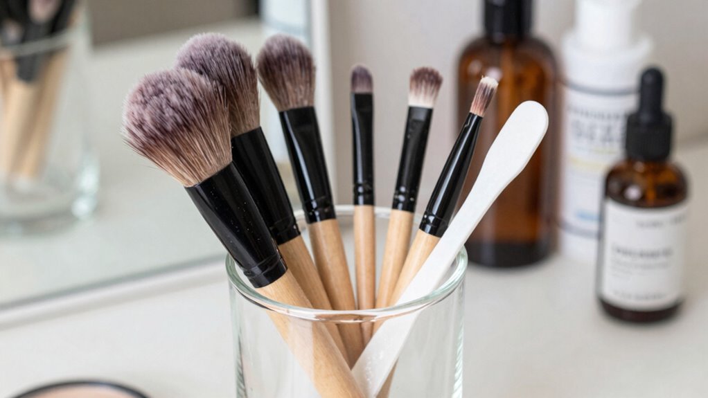 You should replace your makeup brushes every 1 to 2 years to maintain ideal hygiene. Regularly clean your brushes, ideally once a week, using gentle brush cleaning products, and store them properly in a clean, dry makeup brush storage container. This prevents bacteria buildup and guarantees your skin stays healthy. Remember, consistent brush cleaning frequency and timely replacements are key to preventing breakouts and skin infections.