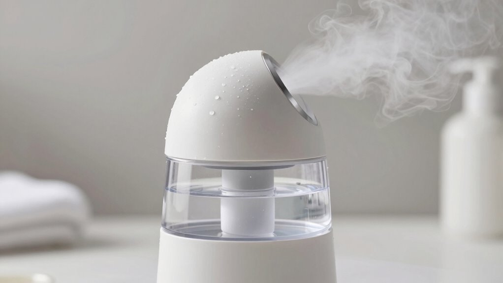 An adjustable arm on a facial steamer makes a significant difference in how comfortably and effectively I can position the device during my routine. It allows me to customize the height and angle for maximum facial coverage and comfort. With flexible arm positioning, I can easily adapt to different facial sizes and treatment preferences, making the deep cleansing experience more effective. An extendable or rotatable arm guarantees even steam distribution across my face, enhancing pore opening and skin penetration. Plus, the ability to modify the arm’s position reduces strain and makes hands-free operation possible when needed. Precise control over the arm’s movement means I can direct the steam exactly where it’s needed, maximizing the benefits and making my deep cleansing routine more efficient.