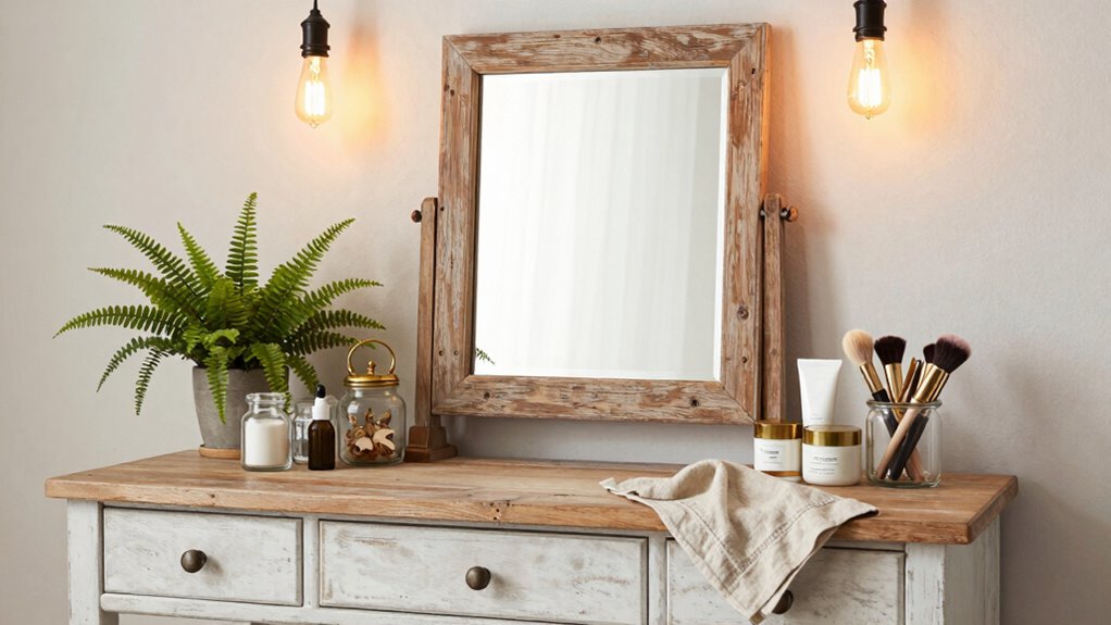 Since organization is key to a functional farmhouse makeup vanity, it’s important to look for storage solutions that suit your needs. Many vanities feature multiple drawers, cabinets, and open shelves to hold everything from brushes to skincare. Specialized compartments, like ring slots, necklace hooks, and earring holes, help keep jewelry and small accessories tidy and accessible. Some designs incorporate concealed shelves behind sliding barn doors, providing extra storage without sacrificing style. Adjustable or customizable dividers in drawers allow for tailored organization of cosmetics, tools, and products. Additionally, glass tops and open shelving improve visibility and easy access, so you can quickly find what you need. Overall, these thoughtful storage features help keep your space neat, functional, and charming.