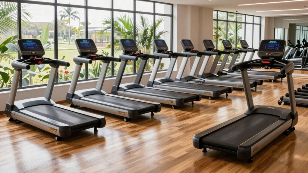 When considering a high-end walking pad with incline, noise level management comes into play, especially if you’re using it in shared spaces. I’ve found that the best models typically range from 25dB to 45dB, ensuring they won’t disrupt your environment. Look for pads with quiet motors, like those with 3.0 HP or higher, as they operate smoothly and minimize sound. Advanced shock absorption systems not only enhance comfort but also help reduce vibrations and impact noise, making workouts quieter. Plus, integrated Bluetooth speakers can elevate your experience without increasing the treadmill’s noise level. By choosing treadmills with noise-reducing technology, you’ll considerably enhance your workout experience, particularly in settings where maintaining quiet is vital.