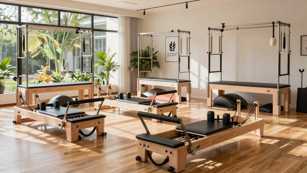 I’ve found that you generally need about 10 feet by 7 feet for a Pilates reformer with a tower. This gives you enough room to move freely and guarantee safety during your workouts. I recommend measuring your space before purchasing to make certain it fits comfortably. Also, consider leaving extra space around the reformer for easy access and storage of any additional equipment you might use.