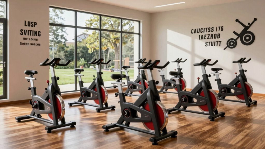 While I appreciate a challenging workout, I also value a peaceful environment. When choosing a premium exercise bike for home use, noise level is essential. I look for models with magnetic resistance systems, which usually operate under 25dB, perfect for apartments or shared spaces. The type of drive system matters too; I prefer belt-driven bikes as they’re quieter than chain-driven ones, offering a smoother ride. Additionally, advanced noise reduction technologies, like inertia-optimized flywheels, enhance operational smoothness. Many premium bikes also feature sound-dampening materials and reinforced frames that further minimize noise. A quieter bike not only improves my workout experience but also lets me exercise at any time without disturbing others in my home.