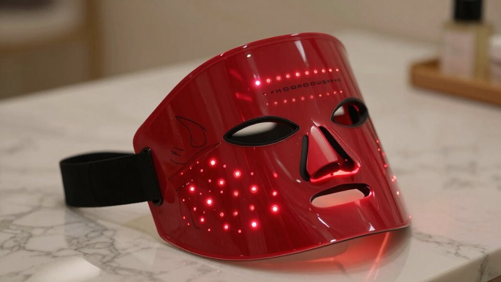Opting for masks made from soft, hypoallergenic materials is vital if you have sensitive skin. Masks crafted from soft or medical-grade silicone are gentle and reduce irritation risks. Hypoallergenic materials help minimize allergic reactions, making them suitable for reactive or delicate skin. Lightweight, flexible fabrics guarantee a comfortable fit, preventing unnecessary pressure or friction that could cause discomfort. Non-irritating, skin-friendly fabrics help maintain your skin’s natural barrier during therapy sessions. It’s also imperative that these materials are free from latex, phthalates, and harsh chemicals, which can trigger adverse reactions. Choosing a mask with these qualities guarantees a safer, more comfortable experience, allowing you to enjoy the benefits of red light therapy without worry about skin irritation or sensitivities.