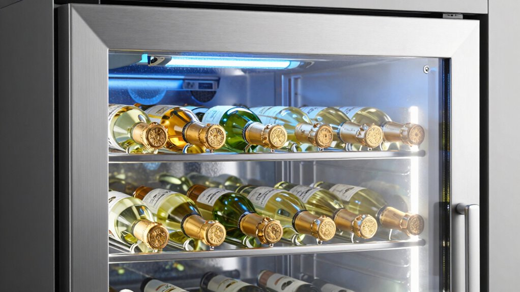 Choosing the right temperature settings on your wine fridge is crucial for preserving the delicate flavors and effervescence of champagne and white wines. Ideally, these wines should be stored between 45°F and 55°F to maintain their freshness and taste. White wines are best kept around 45°F to 50°F, while champagne prefers a slightly cooler range of 45°F to 48°F. Using a dual-zone fridge allows you to set precise temperatures for each type, guaranteeing ideal storage. Adjusting the temperature in 1°F increments helps you fine-tune conditions without abrupt fluctuations. Maintaining a consistent temperature is essential because fluctuations can harm the wine’s aging process and flavor profile. Proper temperature control ensures these wines are served chilled, enhancing their aroma and overall enjoyment.